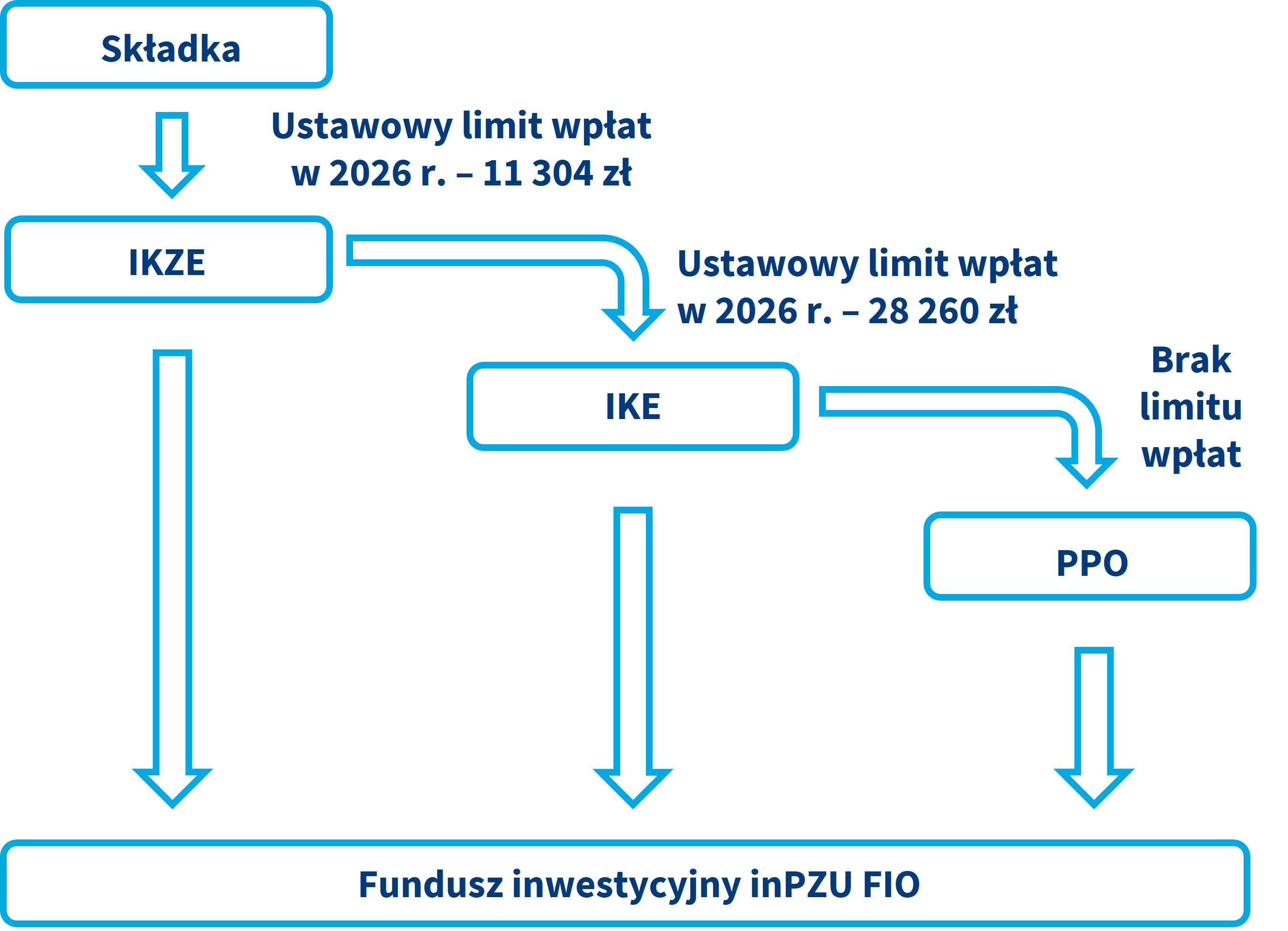 Jeśli – oprócz PPO – wybierzesz tylko jeden z dodatkowych produktów (np. IKZE), wpłaty będą lokowane w pierwszej kolejności w IKZE, aż do wyczerpania limitu wpłat w danym roku kalendarzowym. Po przekroczeniu tego limitu wpłaty będą przekazywane do PPO. W każdej chwili możesz wpłacać na wybrany przez Ciebie produkt PWE bez korzystania z kaskady.